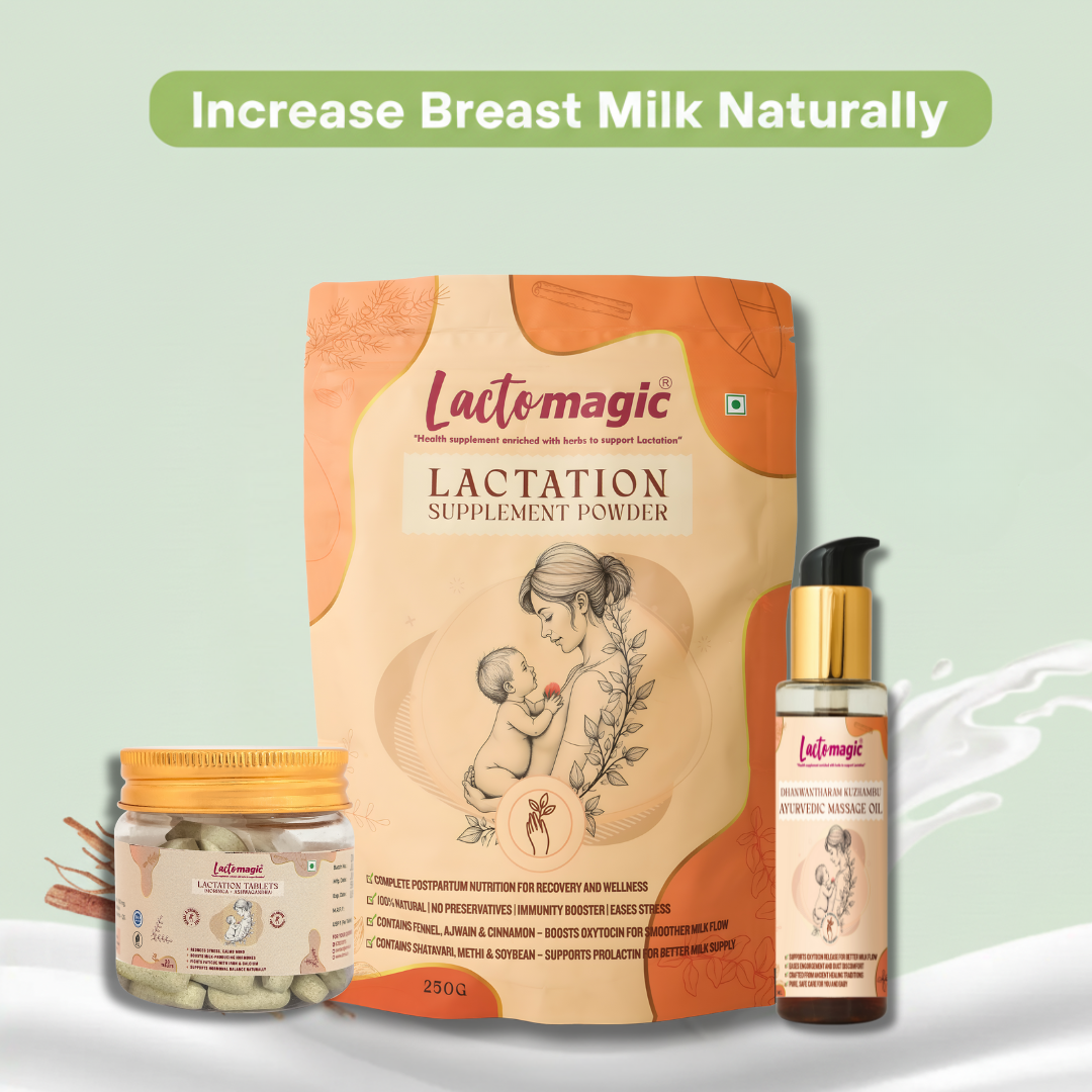 A: Mix 2–3 tablespoons of Lactomagic powder into warm milk or water, twice or thrice daily, as part of your breastfeeding routine. Optionally, pair with Lactomagic tablets and massage oil for enhanced lactation support.