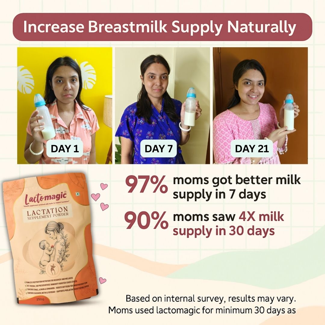 A: Every mother’s body is unique, so results may vary. Most moms start noticing improvements in their milk flow within 7–10 days of regular use. Consistency is key—taking Lactomagic daily as recommended helps nourish your body, balance hormones, and support sustained milk production over time.