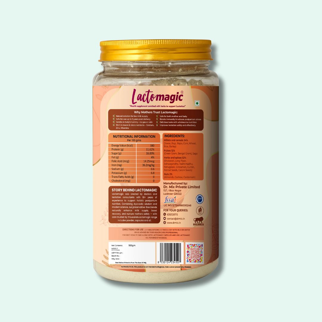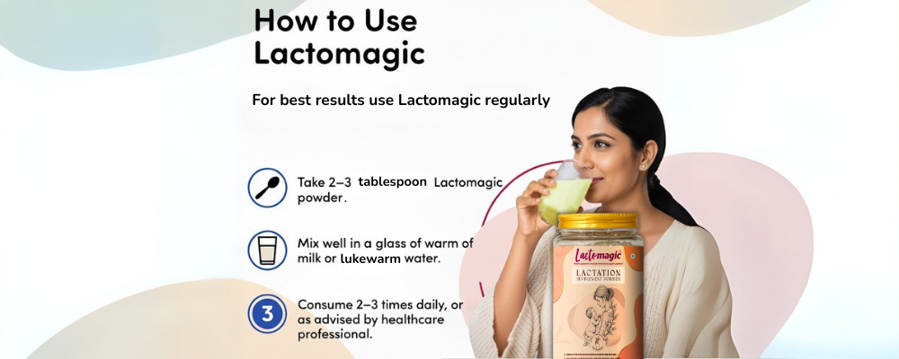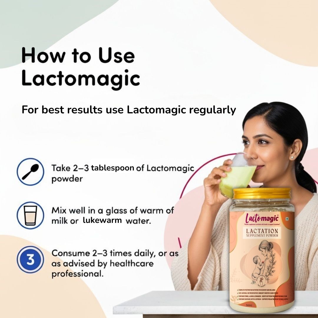 A: Mix 2–3 tablespoons of Lactomagic powder into warm milk or water, twice or thrice daily, as part of your breastfeeding routine. Optionally, pair with Lactomagic tablets and massage oil for enhanced lactation support.