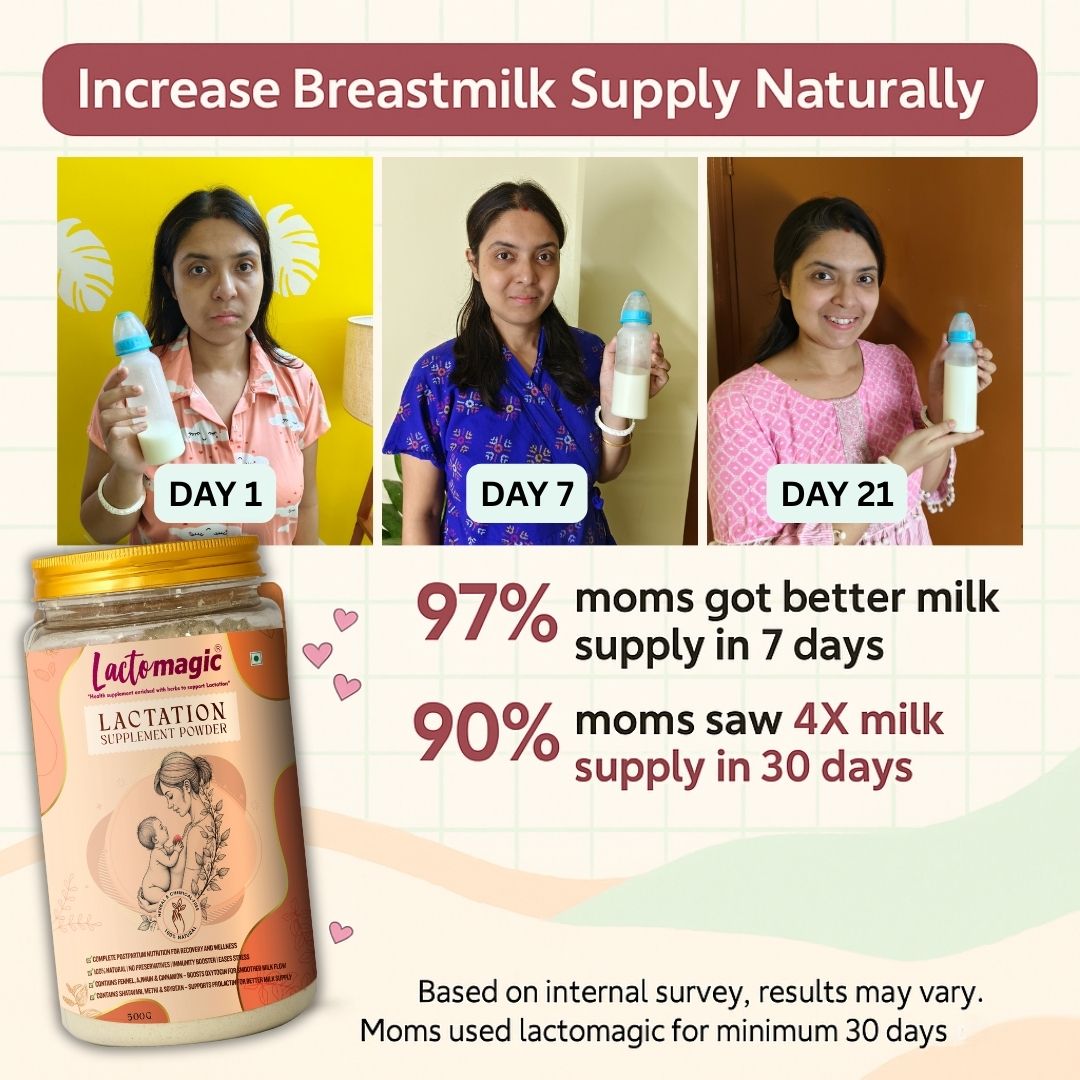 A: Every mother’s body is unique, so results may vary. Most moms start noticing improvements in their milk flow within 7–10 days of regular use. Consistency is key—taking Lactomagic daily as recommended helps nourish your body, balance hormones, and support sustained milk production over time.